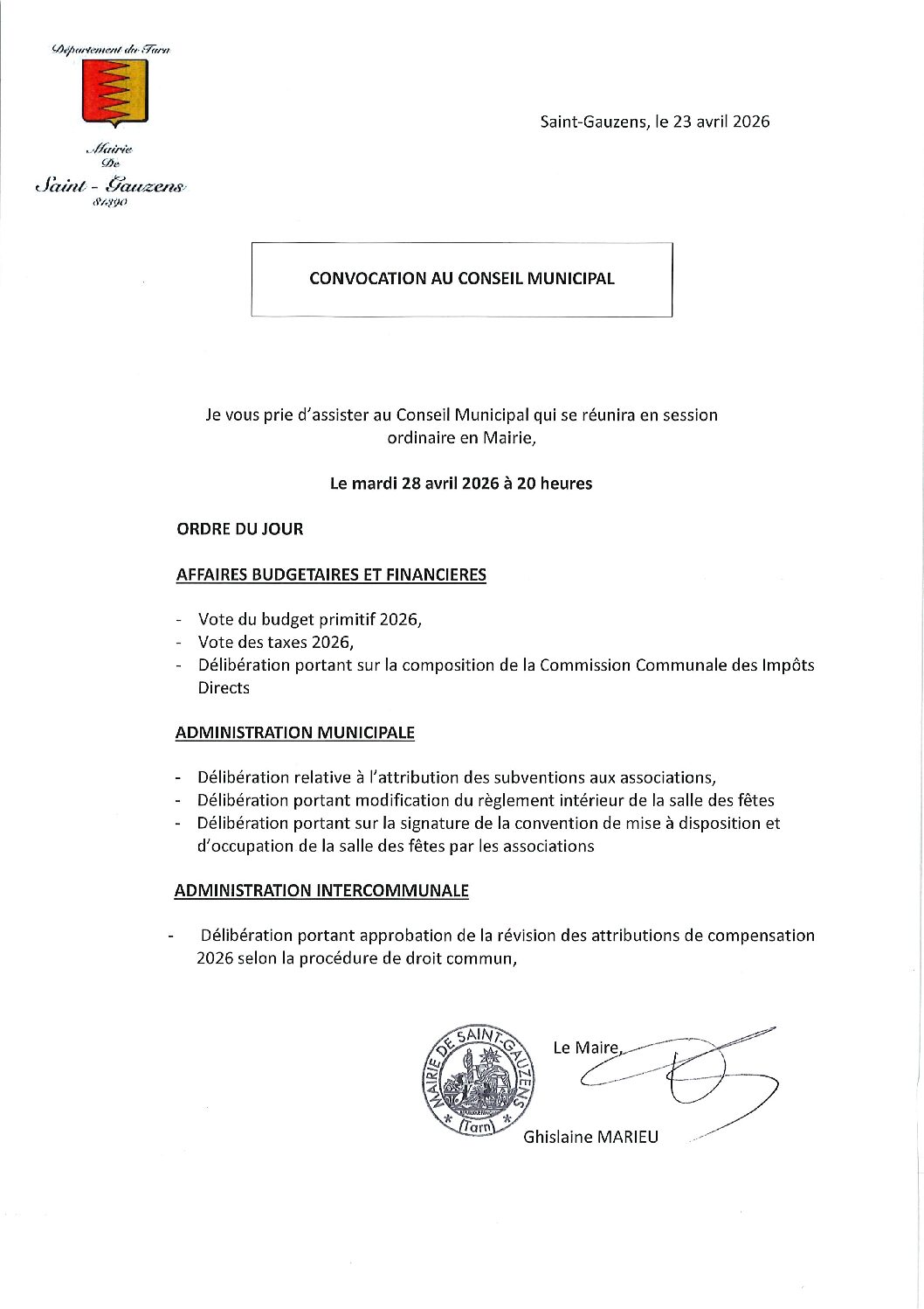 Le Conseil Municipal se réunira le mardi 28 avril 2026 à 20 heures en mairie en session ordinaire.