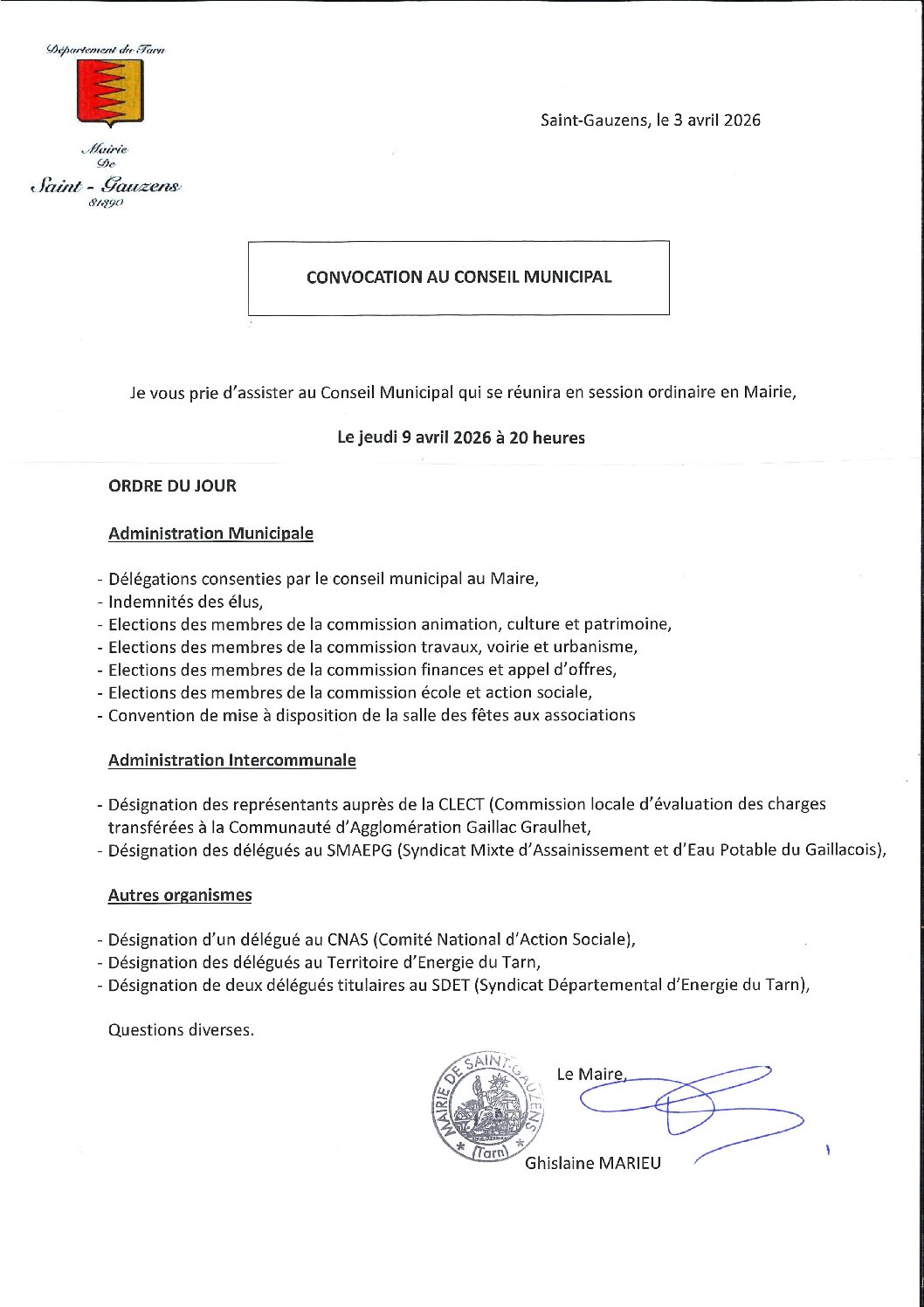 Le Conseil Municipal se réunira le jeudi 9 avril 2026 à 20 heures en Mairie en session ordinaire.